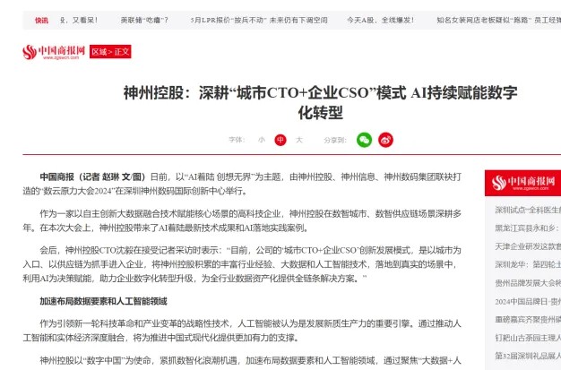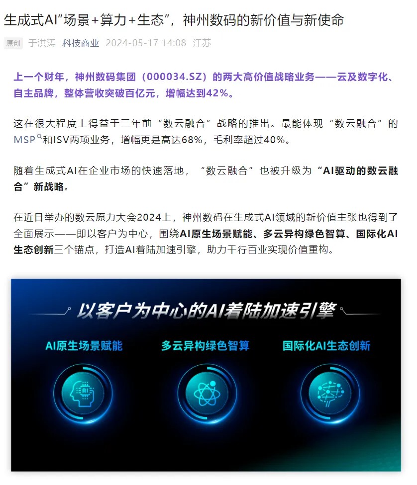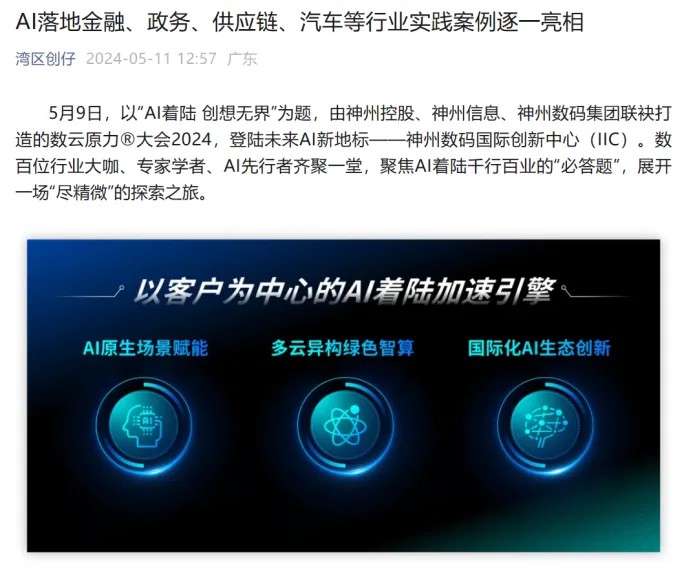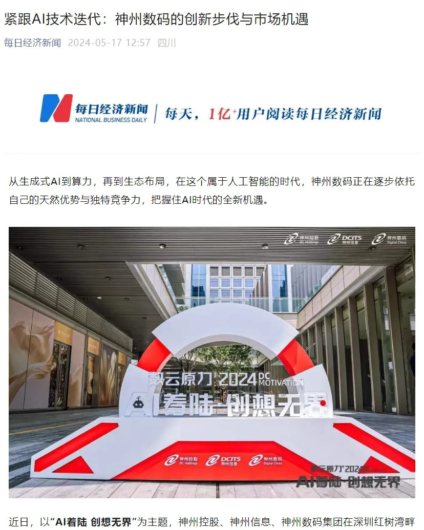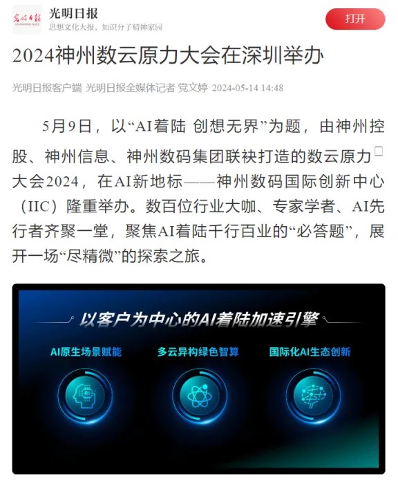 近日,由神州控股、神州信息、jiuyou.com集团联袂打造的年度盛会——数云原力大会2024开幕式,在未来AI新地标——jiuyou.com国际创新中心(IIC)圆满落幕。这场以“AI着陆 创想无界”为主题的活动,不仅引起了业界的广泛关注和讨论,也引发了媒体的争相报道。